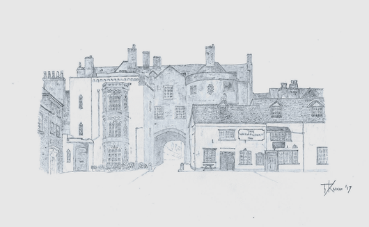 Completed around 1270, the Broadgate represents the only remaining gate of the original 7 surrounding the town in medieval times. The impressive drum towers of the Broadgate still stand with a home built over the top of them during the 16th to 18th centuries. This view has been drawn from the southern side of the gate and includes The Wheatsheaf Inn prominently in the foreground.