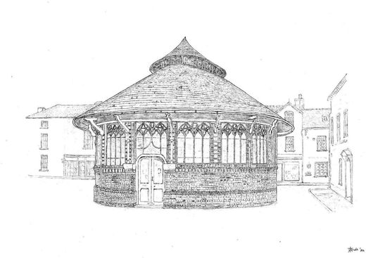 Completed in 1858 by James Cranston, the Round Market in Tenbury Wells features a Chinese Gothic style similar to the Pump Rooms, also in Tenbury. Produce such as apples, pears and plums were traded at the various markets held in and around the Round Market. This view also features the Market Tavern pub on the right hand side.