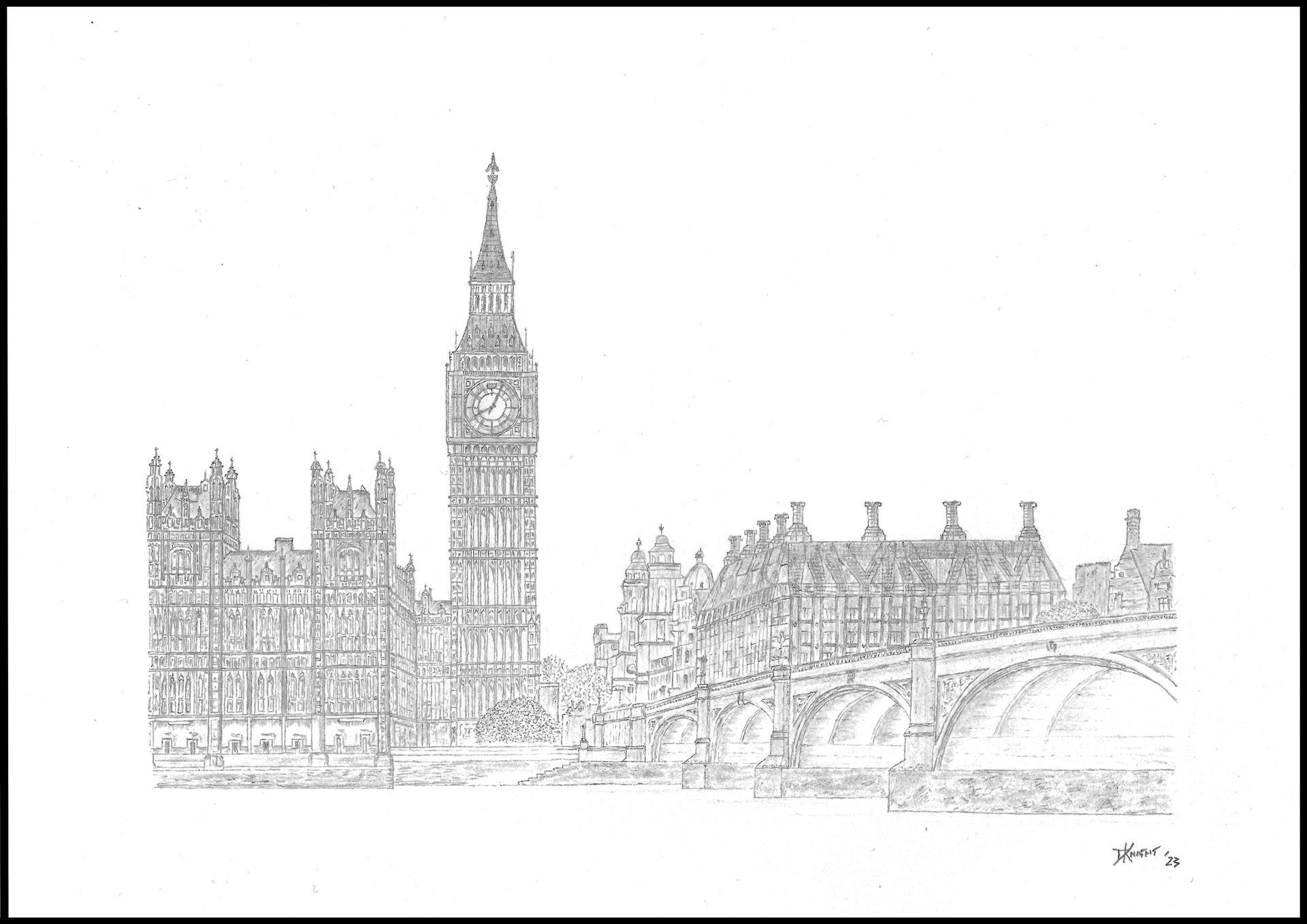 This view from the south bank of the river Thames features the Palace of Westminster (1876), often described as the cradle of democracy, with the imposing Queen Elizabeth II tower and the clock face of Big Ben. Also featured is grade II* Westminster Bridge and Portcullis House in the background.